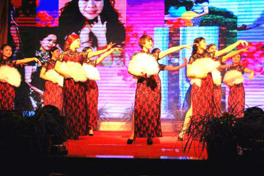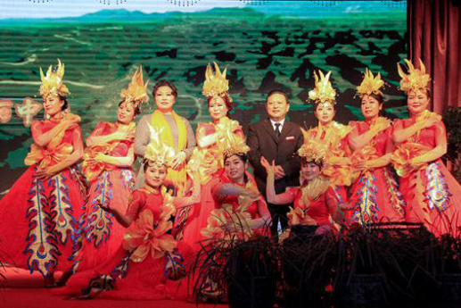 董事長(zhǎng)姜南先生、夫人周玉貞女士與表演者合影留念