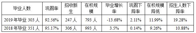 2018年,學校畢業生351人,學生鞏固率94.67%,招收新生306人,在校生規模993人,2019年,學校畢業生303人,學生鞏固率92.56%,招收新生247人,在校生規模793人,相比之下2019年畢業生人數比2018年畢業生人數降低13.68了%,學生鞏固率下降了2.11%,2019年招收新生人數相比2018年招收新生人數降低了19.28%,2019年在校生規模人數相比2018年在校生規模人數降低了11.99%。