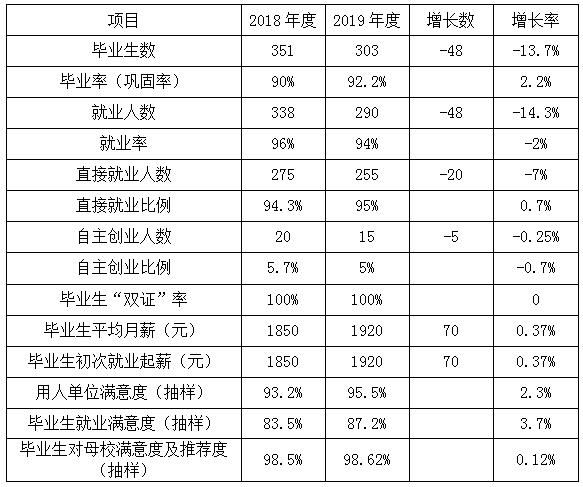 2018年度由于畢業生數量減少,就業人數也有所減少,無升學人數。但畢業生平均月薪提高,就業質量有所提升、畢業生對學校的滿意度也有所提升。具體數據見下表: