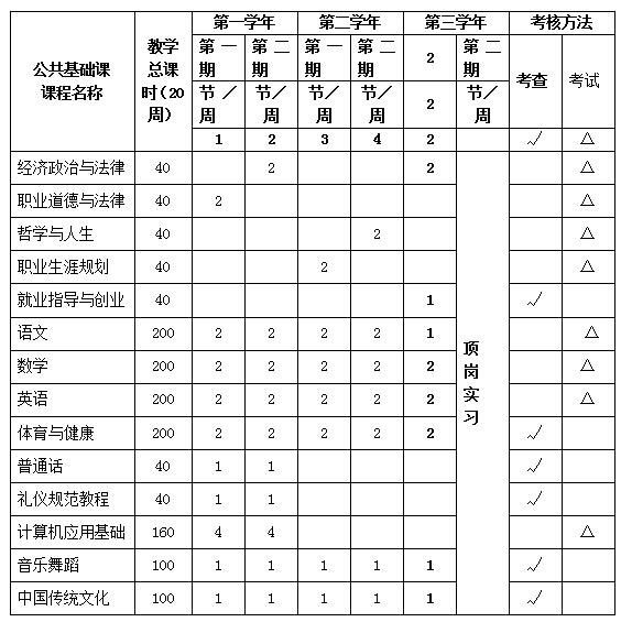 學校公共基礎課,開全課程,開足課時,按課程標準進行教學,較好地完成了各項教學任務。開設《職業生涯規劃》、《職業道德與法律》、《經濟政治與法律》、《哲學與人生》、《就業與創業指導》五門德育課程,開足、開齊、開好語文、數學、英語、體育與健康、音樂舞蹈等課程。學校本著“面向學生實際、滿足升學和就業兩種需求,有利于學生可持續發展”的原則,優化課程結構,改變了傳統單一的講授法,提倡教師使用啟發式、討論式、辯論式、情景式等授課形式,培養學生的職業素養和文化素養,調動學習積極性。