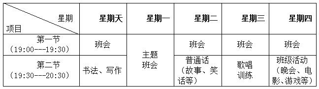 學校實行晚自習班主任到班制度,晚自習前半小時為班會時間,由班主任對學生開展德育教育與班級事務安排,后一小時為素質能力培養時間,由班主任組織學生開展。具體安排為:周一普通話訓練、周二演講(故事、笑話、朗誦等)、周三唱歌、周四班級活動(生日晚會、電影、游戲、聚餐等)、周日書法與寫作,全面提升學生的綜合素質。