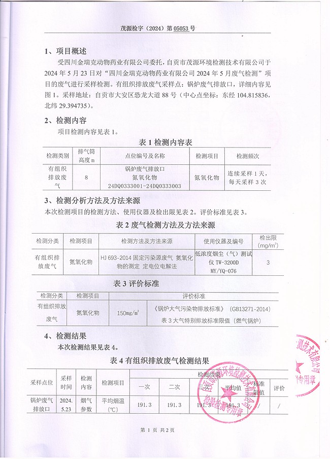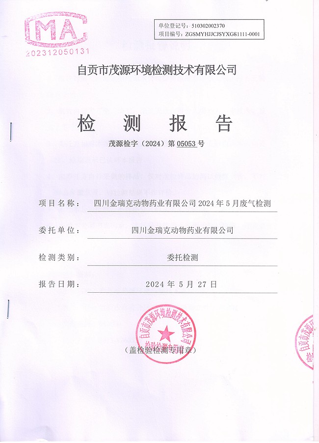 四川金瑞克動物藥業有限公司2024年5月廢氣檢測報告