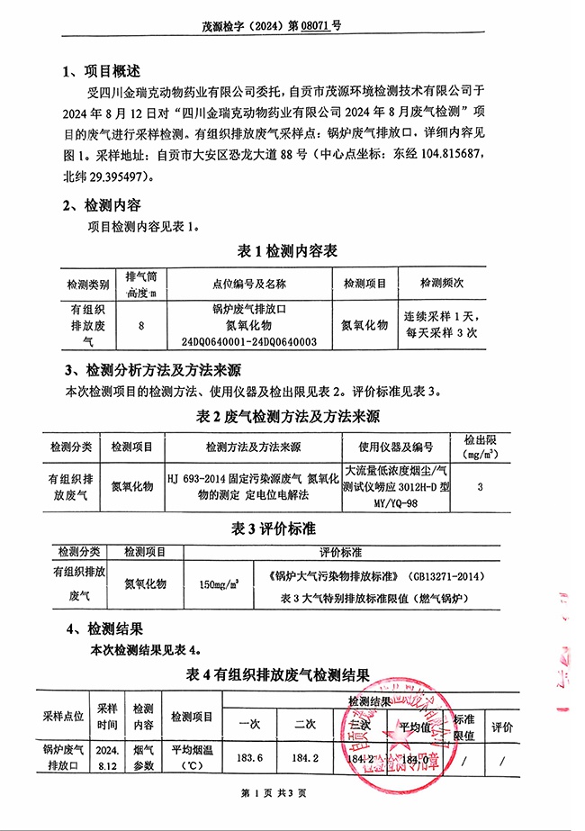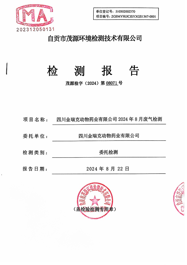 四川金瑞克動物藥業(yè)有限公司2024年8月廢氣檢測報告