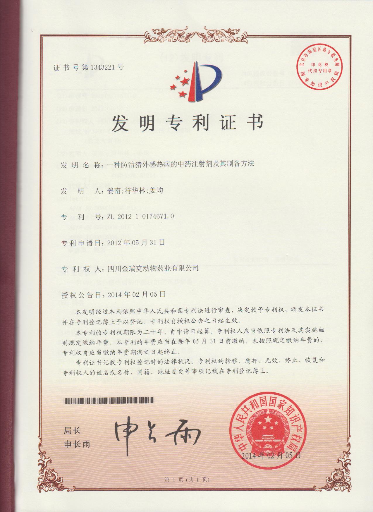 金瑞克豬外感熱病專利